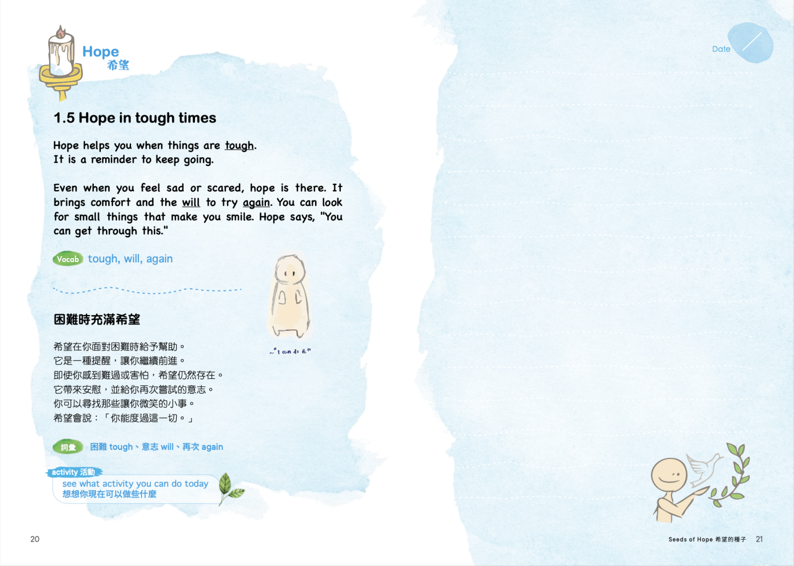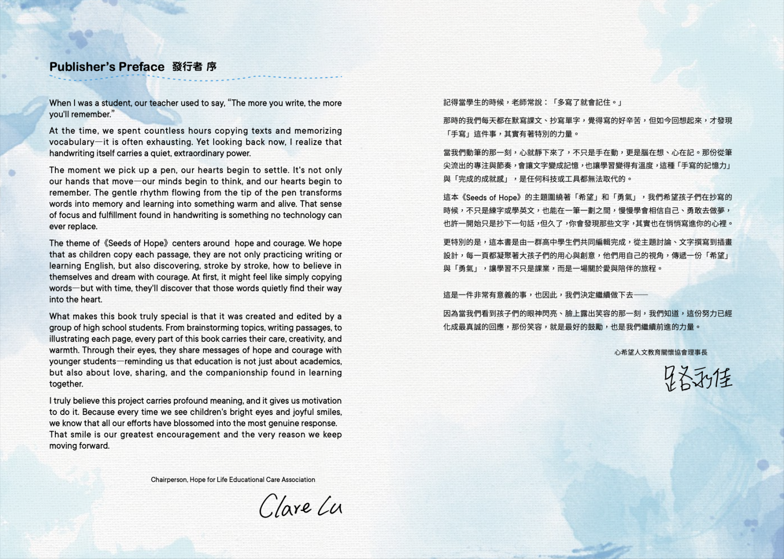心希望人文教育關懷協會長期關注偏鄉教育,也深刻理解孩子在不同學習環境中,都可能面臨資源不足、信心不足,或缺乏陪伴與鼓勵的時刻。因此,基於這樣的理念,我們首先設計了這套英文手抄書,提供一種簡單、可長期使用、容易被實踐的學習方式。